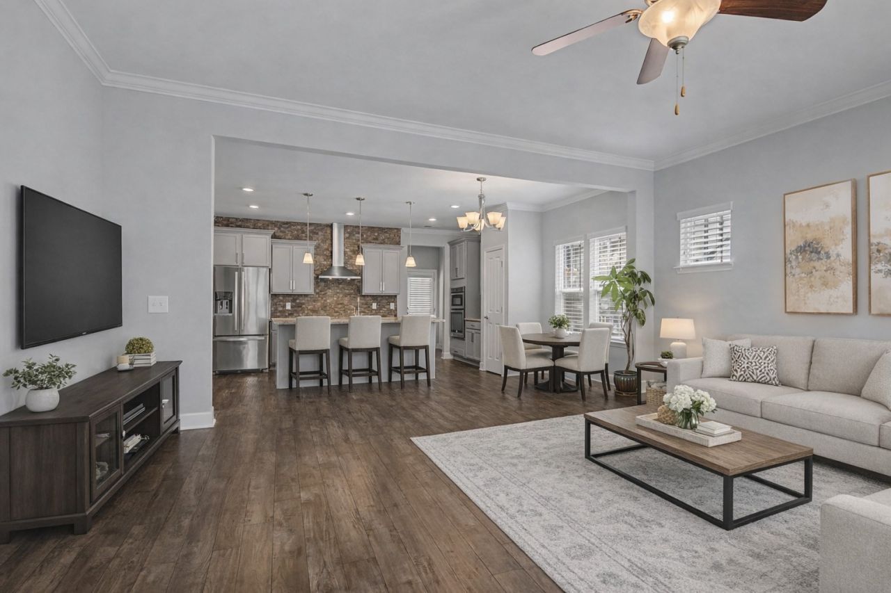 Discover the perfect townhome in Carothers Crossing! Ideally positioned on an end unit, this home is filled with natural light and welcomes you with a charming front porch.A rare find in the community, the primary suite is conveniently located on the main level, offering comfort and accessibility for a variety of lifestyles. The open and spacious floor plan is perfect for both everyday living and entertaining.Enjoy a luxurious primary suite downstairs, along with two generously sized bedrooms upstairs. Outside, you'll find a private yard ideal for play or pets, plus a patio perfect for relaxing or hosting guests. The home also features a two-car garage for parking and additional storage.Additional highlights include beautiful hardwood floors throughout the main level, a built-in desk area in the kitchen, a pantry, and a large laundry room, all thoughtfully designed to make everyday living comfortable and convenient.